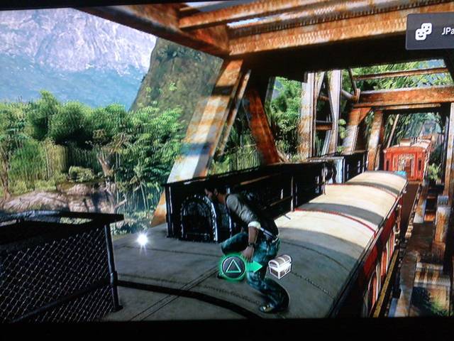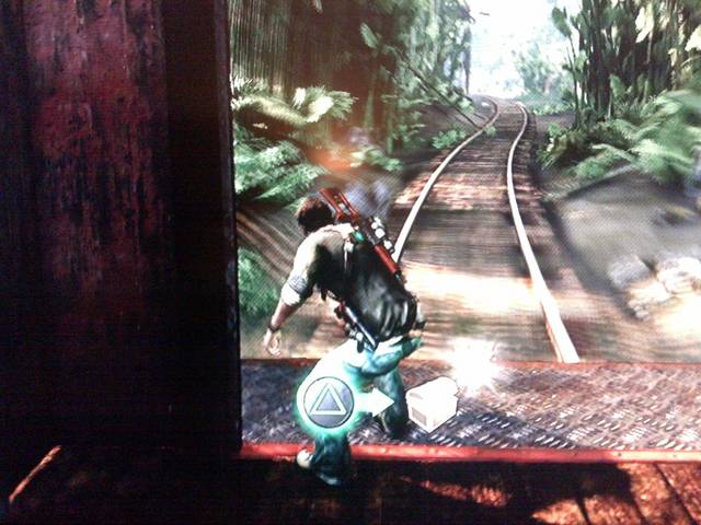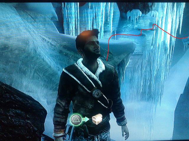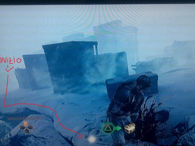 Una volta attaccati alla corda non saltate dall’altra parte, ma dondolatevi verso il muretto diroccato a destra di dove dovreste proseguire. Dondolando abbastanza vicino al muretto comparirà l’icona del tesoro, premete triangolo al volo per prenderlo.