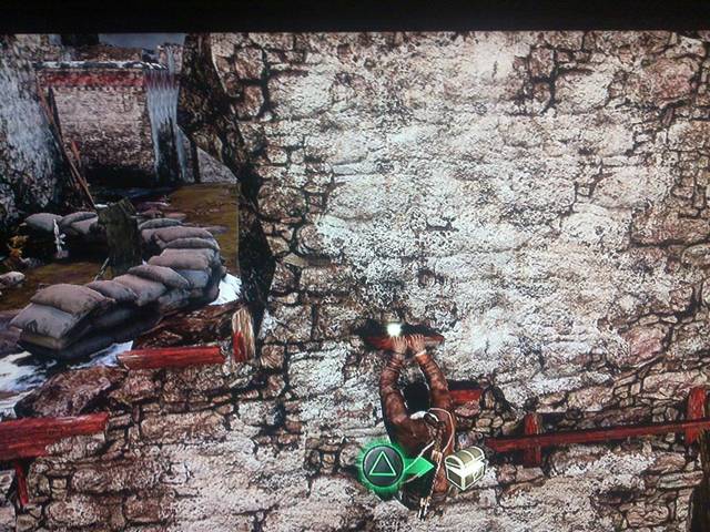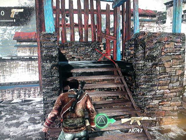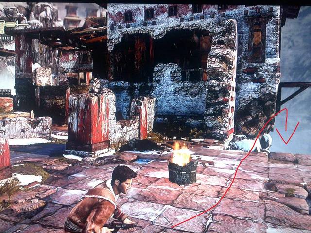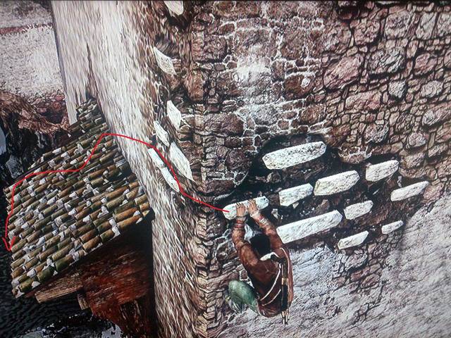 Offertorio d’argento: Dopo aver visto Lazarevic e i suoi uomini che portano Schafer nella torre, alite le scalette diroccate e saltate dall’altra parte. Ora voltatevi per ritrovarvi più o meno come mostrato in foto. Aggrappatevi di lato alla piattaforma sulla quale siete atterrati, poi scendete aggrappandovi alla travetta rossa, e proseguite sul pezzo di muro rosso a destra per trovare il tesoro.