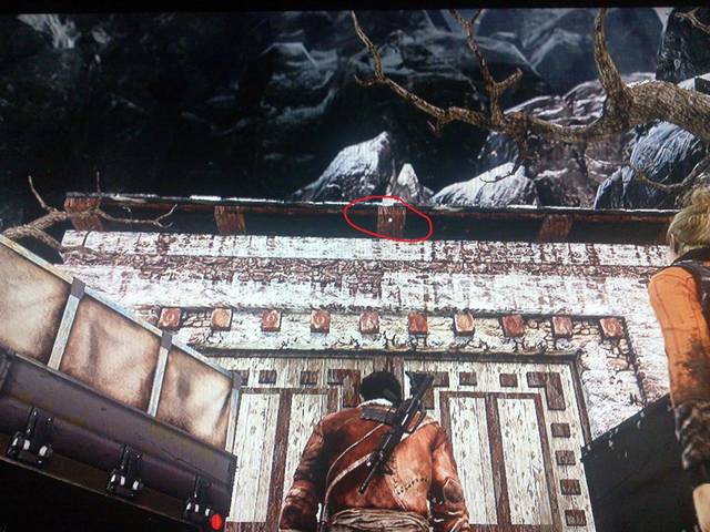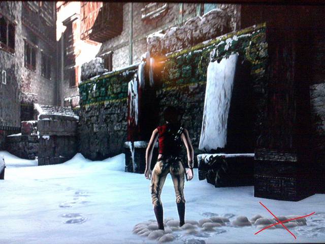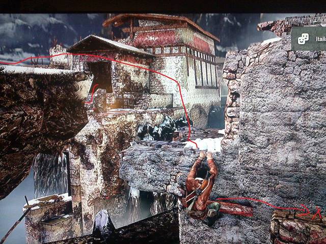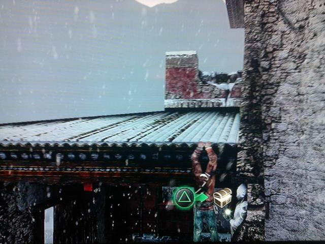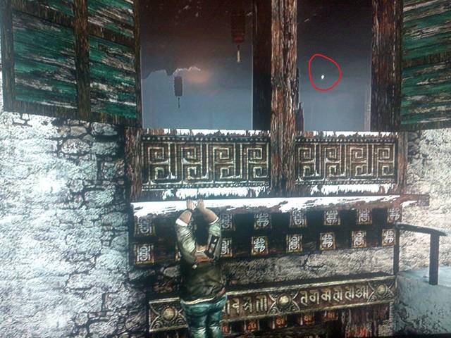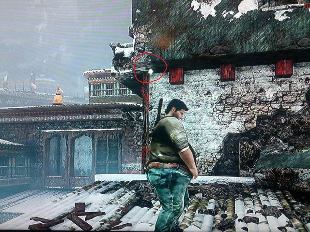 Ghau rettangolare tibetano: Proseguendo dal tesoro precedente dovrete, ad un certo punto, salire su 2 mobili rossi per arrivare su un tetto diroccato. Voltatevi e aggrappatevi al bordo del tetto come mostrato in foto per trovare il tesoro.