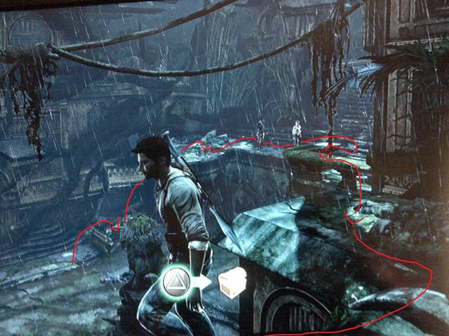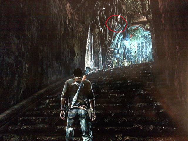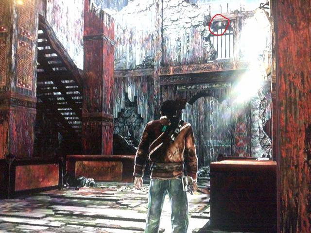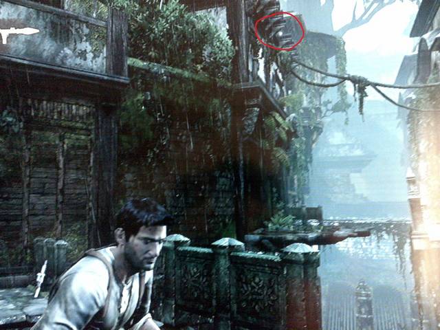 Ornamento di osso intagliato: Superato l’enigma dei 4 pezzi colorati da mettere sui pulsanti giusti, Nate scoverà la posizione dell’entrata segreta, usate la corda per arrivare sugli altri tetti. Proseguite fino ad arrivare a delle scale con un precipizio al centro. Saltatelo e voltatevi guardando in alto, per vedere il tesoro brillare nella lampada sul soffitto.