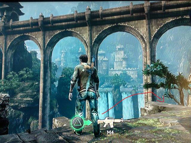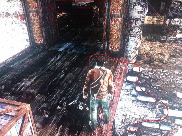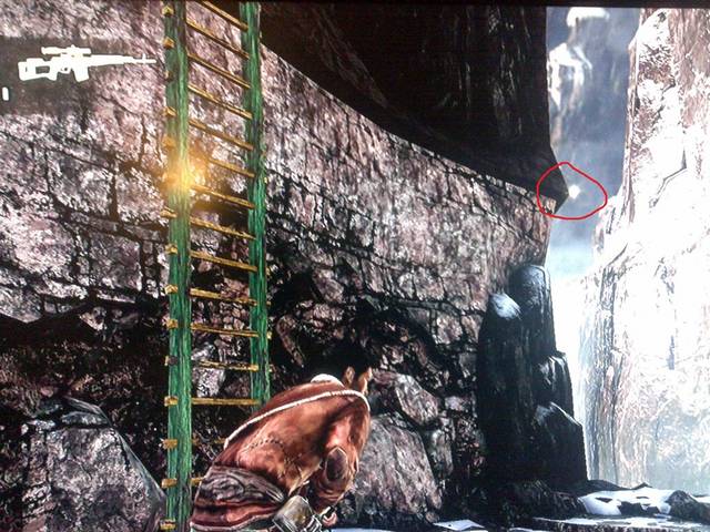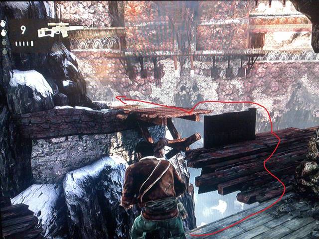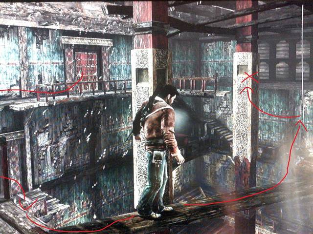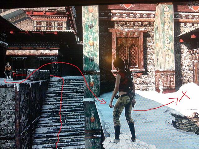 Vaso rituale tibetano: Fuori dalla stanza dove avete trovato Schafer, girate a destra e camminate sull’asse. Saltate sul ponte successivo e attraversate l’altra asse. Ora afferrate la corda e dondolatevi verso la colonna contrassegnata in foto per prendere il tesoro.