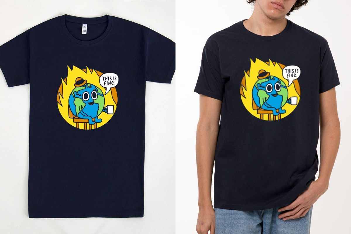 Chiudiamo i consigli per gli acquisti con una t-shirt a sfondo nero con una grafica che unisce l’ironia e il divertimento di un meme a una problematica purtroppo che il nostro pianeta subisce da anni come il riscaldamento globale: la Terra che dice “Sto bene” nonostante le fiamme che l’avvolgono.