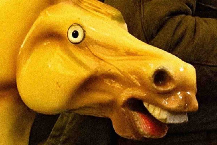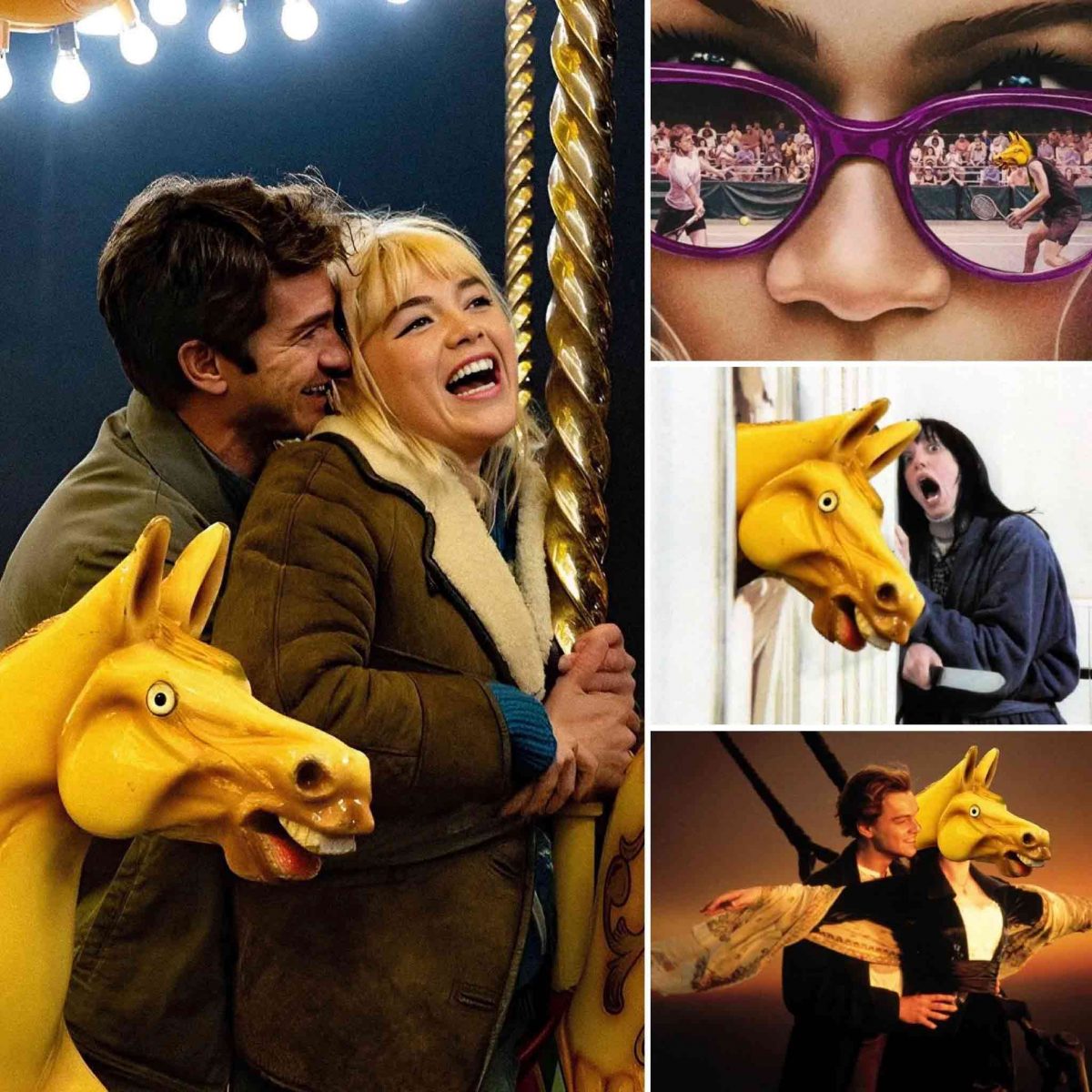 Svelato il mistero del cavallo bizzarro che, come si può notare, è semplicemente uno di quei cavallucci presenti nelle giostre per bambini ma che da adesso in poi, soprattutto per l’internet, è diventato il vero protagonista del film e dei film come potete vedere dalle numerose creazioni meme a destra dell’immagine. Il cavallo invade Shining, Titanic e anche il recente Challengers con Zendaya.