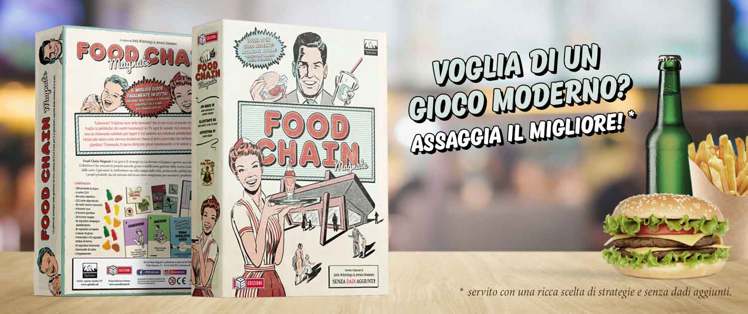 Food Chain Magnate è un gioco da tavolo strategico in cui si sviluppa e gestisce una catena di fast food con un’azzeccatissima grafica anni ’60, e ora sta arrivando la sua ristampa in occasione del lancio della nuova espansione Ketchup e Altre Idee in italiano. I giocatori si confrontano sulla mappa di una città producendo e marketizzando i propri prodotti, e solo nel gioco base sono presenti almeno 200 prodotti in legno, circa 300 carte, tessere e segnalini di tutti i tipi.