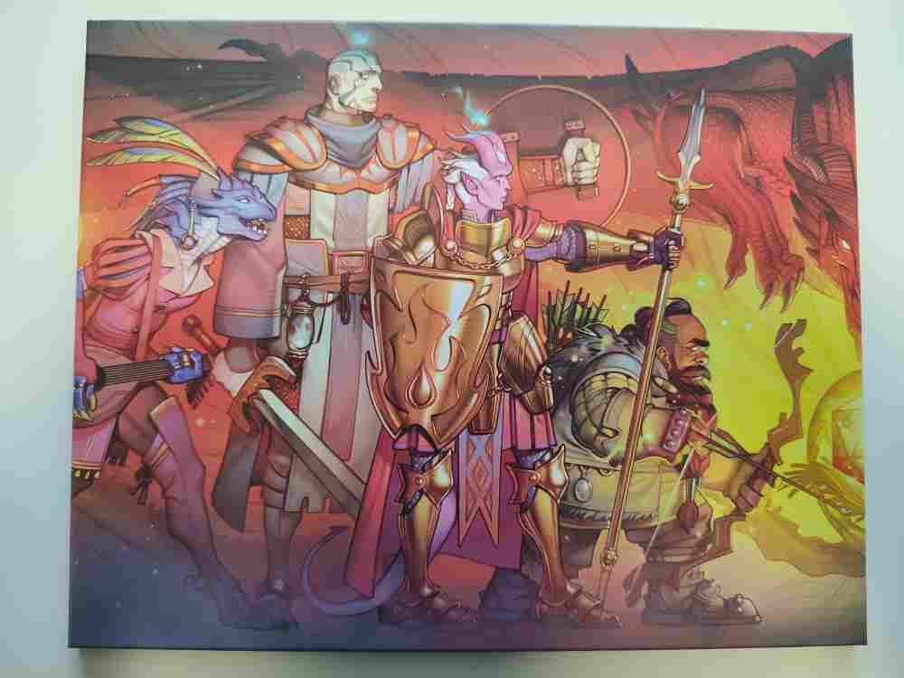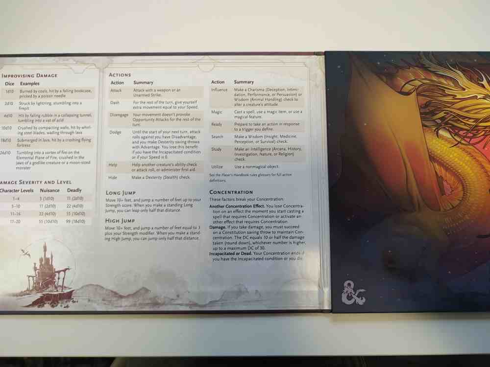 Lo schermo del Dungeon Master porta come cover delle illustrazioni di natura differente dal resto del manuale. Laddove D&D 2024 ha omologato lo stile su uno più realistico e meno astratto, lo schermo del dungeon master presenta un’illustrazione che potrebbe essere diegetica all’ambientazione stessa, in uno stile che ricorda quasi Dragon Age ai tempi d’oro.