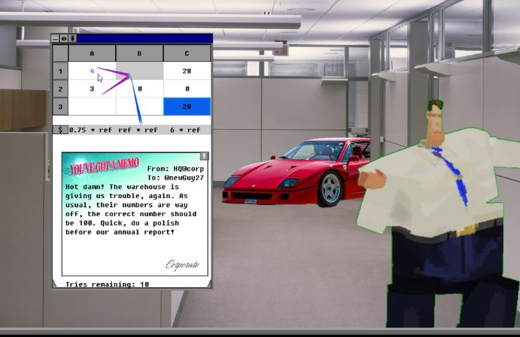 La particolarità di questo gioco, oltre a tutto quello che abbiamo detto, è che la grafica è in pixel art e ricorda i titoli punta e clicca dei primi anni ’90: questo tuffo nel passato non è solamente nello stile grafico, perché anche gli elementi di gioco risalgono a quell’epoca dato che il sistema operativo sul quale si svolgono tutti gli enigmi in Excel è Windows 3.1, ovvero una delle primissime versioni dell’OS di Microsoft lanciata per la prima volta nel 1992 con tanto di assistente Corpy, una parodia della graffetta a dir poco molesta Clippy.