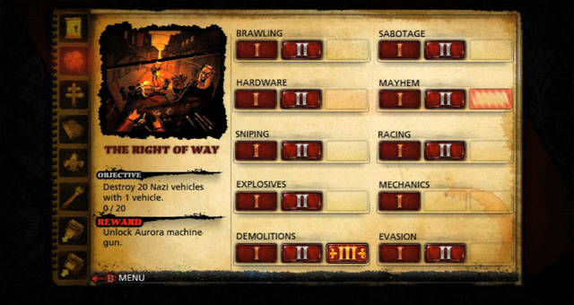 Per concludere con le meccaniche di gioco, segnalo che anche qui potremo far crescere il personaggio ovviamente andando a completare delle fasi che saranno pienamente in linea con quello che ci aspetta da un membro della resistenza francese: per avere maggiore controllo sulle “azzuffate” o sugli “armamenti” dovremo pestare i crucchi a mani nude o assestargli qualche bel colpo in testa. Abbiamo poi la “precisione”, gli “esplosivi”, la “demolizione”, il “sabotaggio”, le “gare” che crescono di livello man mano che compiremo qualcosa di inerente a queste specialità. Oltre a migliorare le nostre abilità principali o ad evolversi con le armi e il combattimento corpo a corpo, sappiate che ci sarà data la possibilità di crescere anche come “fama” per quanto riguarda i partigiani che successivamente ci daranno una mano sempre più crescente nelle nostre missioni (anche qui spunta fuori il fantasma di Assassin’s Credd dove era la popolazione ad aiutarci contro le guardie che ci inseguivano).