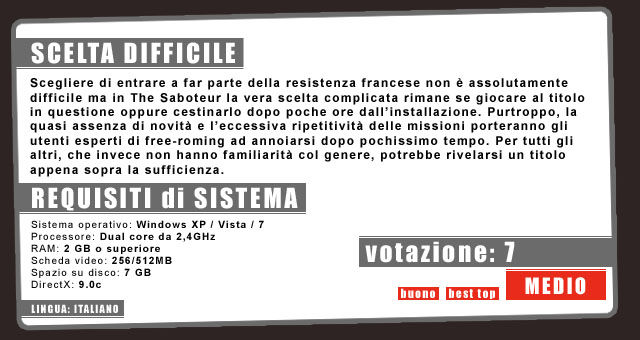 Cinque o sei anni fa si parlava di come il videogioco, inteso come format di divertimento, dovesse subire una mutazione che lo portasse a percorrere la via del gameplay universale: in parole povere, si immaginava un gioco in cui ogni utente potesse fare o avere un controllo quasi perfetto di ogni elemento lo circondava. Utopia? Assolutamente si ma negli ultimi due anni, questo pensiero si sta leggermente concretizzando con titoli che utilizzano la chiave del “free-roming” o della crescita del personaggio in maniera sempre più crescente: detto questo, The Saboteur non è e non sarà l’ultimo della serie a fare di queste premesse uno dei suoi cavalli da battaglia.