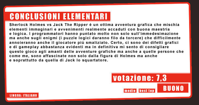 Quando la redazione di games.it mi ha spedito a casa questa nuova avventura grafica dal nome di Sherlock Holmes vs Jack The Ripper, non ho potuto fermare le immagini del mio passato in cui, notte dopo notte, divoravo saggiamente non solo romanzi ma anche i racconti del famoso investigatore Holmes, creato dalla penna di Arthur Conan Doyle. Ma i ricordi non si sono fermati ai caratteri dei libri ma hanno riportato alla luce anche svariate sequenze dei vari film dedicati ai personaggi di Holmes e del mitico aiutante Watson. Ora, dopo anni che mi ero dimenticato di loro, tornano di prepotenza nella mia vita e lo fanno con un videogames di tutto rispetto che non aggiunge nulla di nuovo alle avventure grafiche ma che perlomeno non è il solito prodotto di mercato.