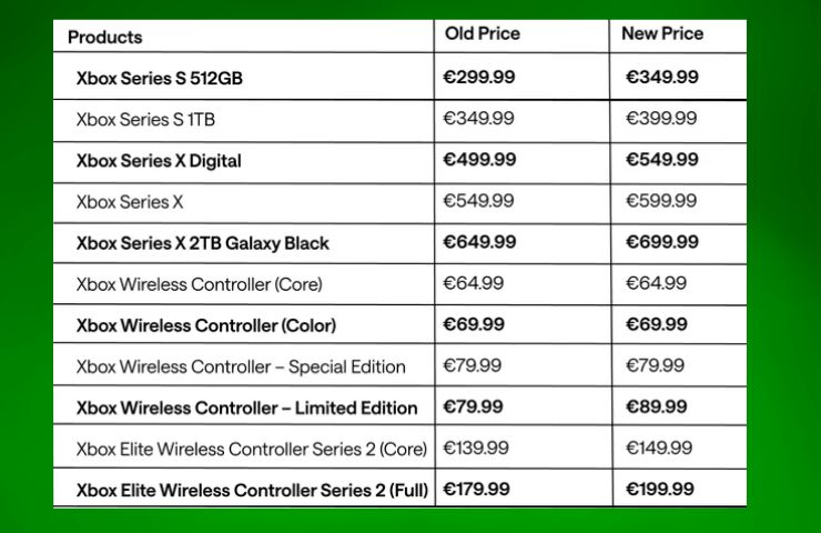 Arrivando al succo del discorso ciò che interessa maggiormente a tutti chiaramente è capire quali saranno i nuovi prezzi e la risposta ce la fornisce Microsoft stessa con il suo nuovo listino: da come si può notare ci sarà un aumento di 50€ su tutte le console Xbox Series, un aumento di 10€ sui controller e di 20€ sul Controller Serie 2.