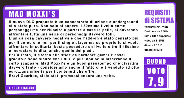 Dopo qualche mese dall’uscita ufficiale di Borderlands, i programmatori di Gearbox hanno mantenuto pienamente la parola sulle aggiunte di nuovi contenuti per la loro ultima fatica. Il gioco in questione è uno dei più ricchi dal punto di vista dei contenuti aggiuntivi tramite DLC. Non solo è uscito da poco meno di un mese la prima espansione ma ora ci “tocca” comprare (al prezzo di otto euro) anche questo succoso Mad Moxxi’s che, a differenza del precedente, aggiunge tre arene (hellburbia, angelic ruins, the gully) in cui combattere allegramente.
