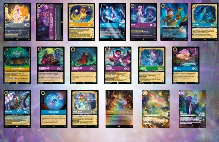 Andando a dare un’occhiata più nel dettaglio delle carte che saranno presenti nel set “Sussurri nel Pozzo” possiamo trovare diverse illustrazioni particolari come ad esempio la Pentola Magica e Re Cornelius da “Taron e la Pentola Magica“, tre carte olografiche dedicate a Gaston, Ariel e Ade e molto altro ancora che potete vedere dall’immagine sottostante.