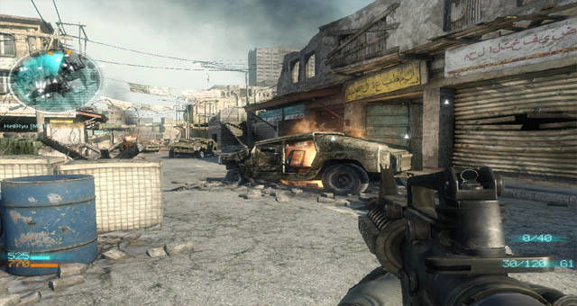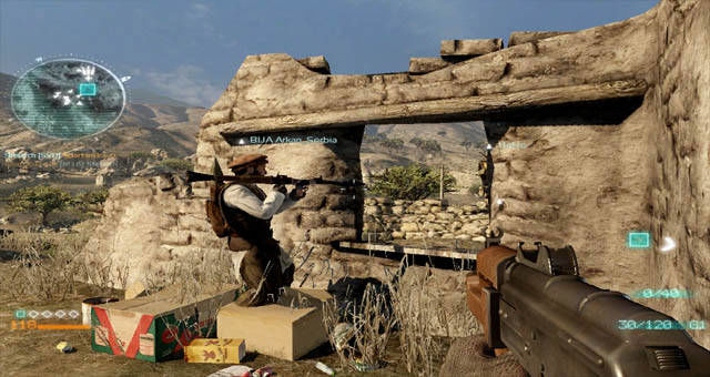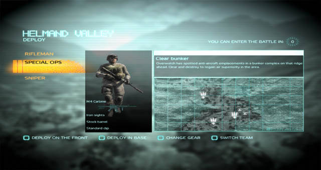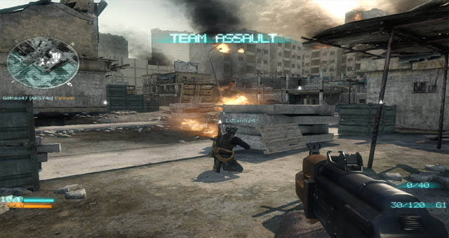 Sul fronte del gameplay, il gioco mi ha lasciato un bella sensazione per quanto riguarda gli scontri, sempre frenetici e immediati. Morire e riapparire sulla mappa è qualcosa di immediato e calibrato, verremo sempre riportati o alla base o in un luogo di sicura copertura. Gli schemi purtroppo non permettevano grosse novità e il tutto finisce per essere un enorme deathmatch a squadre, anche quando si cerca di mantenere la posizione conquistata (la combat mission): proprio per questo, l’avanzamento alla missione è assolutamente lineare e mai caotico. Sulla mappa in alto a sinistra, fra l’altro, verranno visualizzate le forze in campo con delle freccette blu per i nostri commilitoni e arancione per il nemico, utile per scovare facilmente gli avversari.