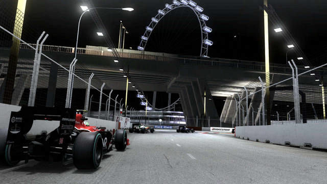 Tornando agli aspetti positivi c’è il sistema che gestisce le fasi del giorno ed il meteo. Tolto il sole alto, il tramonto di Abu Dhabi ed il GP notturno di Singapore che presentano luci e rese grafiche grandiose, ciò che lascia veramente a bocca aperta è il meteo. Maggiore è la lunghezza del GP che affronteremo, maggiori saranno le possibilità di ritrovarci a dover gestire fasi alterne di meteo. Si può infatti cominciare con gara bagnata per concludere con gara asciutta o anche ritrovarci con continui scrosci di pioggia alternati a brevi momenti di sole. Tutto questo non è solo un aspetto grafico, ma anche, se non soprattutto, fisico. Con la pioggia la monoposto deve esser gestita diversamente dal giocatore sfruttando un carico maggiore per ottenere più grip e qui viene utile il menu di pausa attivabile in qualsiasi momento dove potremo modificare l’incidenza degli alettoni. Più importante sarà però la decisione su quali coperture utilizzare, perché se le slick ovviamente non sono adatte al bagnato, la differenza tra intermedie e full wet è ampia. Le gomme intermedie sono adatte quando la pioggia che cade è poca ma continua, mentre le full wet sono utili quando ci si ritrova con un acquazzone tale che fa le onde in curva. Ritrovarsi poi con il meteo che cambia a gara già avviata è una variabile aggiuntiva che rende la gara decisamente più interessante. Qui il giocatore deve capire se e quando conviene cambiare i pneumatici, tenere infatti gomme da bagnato su pista asciutta porta i pneumatici ad un rapido degrado, attenuabile spostandoci dalla scia ideale per trovare un po’ d’acqua, mentre l’uso delle slick sull’acqua non può che portarci ad essere una trottola in mezzo alla pista. In altre parole, la scelta sbagliata ci manderà fuori pista o in coda al gruppo, mentre quella azzeccata metterà tra noi ed il nostro avversario diretto, decine di secondi di distanza a nostro vantaggio.