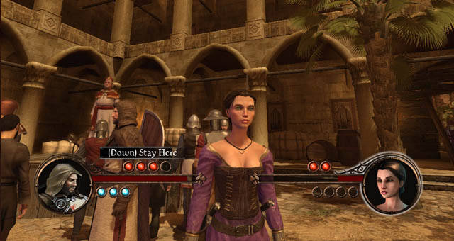 Ringrazio tantissimo i programmatori che hanno scelto questa opzione onde evitare ulteriori bestemmie da parte del sottoscritto e credo di molti altri giocatori al mondo. Sempre per quanto riguarda i comandi nel combattimento, sappiate che a schermo verranno visualizzate le mosse dell’avversario quindi quando vedrete una icona arancione sulla testa di un Saraceno, saprete che in quel momento dovrete difendervi…con lo scudo si difenderanno loro e con le spade di colore rosso, stanno per sferrarvi un attacco potente: la soluzione è ottima e intuitiva per tutti quindi, bravi.