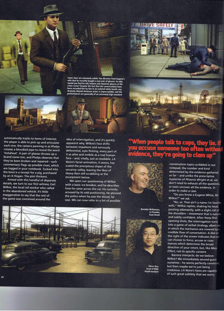 Componente principale del gioco è dunque l’aspetto investigativo su cui si basa tutto LA Noire. Ogni caso richiede diverse fasi, dalla raccolta degli indizi e delle deposizioni sino allo studio delle prove necessario per incastrare i colpevoli. Facendo pochi errori e incastrando i colpevoli in breve tempo, otterremo una classificazione migliore del caso da parte del nostro capo e man mano che assicureremo delinquenti alla giustizia, muteremo il nostro stato passando da poliziotto di pattuglia a detective dei dipartimenti Traffico, Droga, Incendi Dolosi ed infine Omicidi.