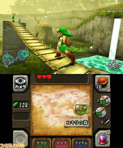 Rispetto alla versione originale del 1998, tutto questo non è cambiato, ma la versione 3DS offre ai giocatori l’esperienza più completa e fluida in assoluto. Al titolo è stata aggiunta la Boss Battle Challange e riproposta la Master Quest, ma la vera innovazione sta nel secondo monitor della console portatile di Nintendo. Partiamo proprio da quest’ultima caratteristica. La presenza del secondo monitor ha permesso agli sviluppatori di rimuovere completamente uno dei maggiori problemi del titolo originale, ossia il continuo mettere in pausa il titolo per accedere all’inventario o alla mappa. Ora tutto è a portata di stilo con la mappa mostrata di default in modo da rendere più fluido l’incedere all’interno e all’esterno dei dungeon e l’inventario che si apre con un semplice tocco su di una icona, il che rende più semplice indossare o svestire un particolare abito o arma. Una maggiore fluidità comporta un migliore feeling con il gameplay, un numero minore di momenti che spezzano l’azione e generalmente un maggiore senso di appagamento. Senso che potrà essere stimolato nei giocatori più hardcore dalle due modalità aggiuntive. La Master Quest non è altro che una riproposizione del gioco con il mondo specchiato, ciò che stava prima a destra, ora si trova a sinistra e viceversa. Per quanto possa sembrare banale, questa semplice modifica da una nuova vita al gioco che, pur senza una nuova trama, offre un modo diverso di rigiocare. La seconda modalità è la Boss Battle Challange, una sfida che ci consente di affrontare in sequenza tutti i boss della storia di Ocarina of Time fintanto che avremo energia. Si tratta di una sfida contro se stessi ed il tempo, ogni scontro è infatti cronometrato e può essere ripetuto per stabilire record sempre migliori.