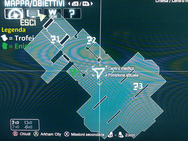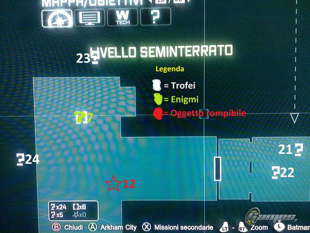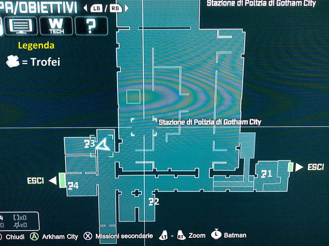 Trofeo Enigmista 19: Per aprire la cupola che racchiude il trofeo dovrete posizionarvi davanti ad essa e lanciare il Batarang telecomandato dal corridoio da cui siete venuti, e raggiungere l’interruttore che si trova esattamente dietro al muro accanto alla cupola con il trofeo.