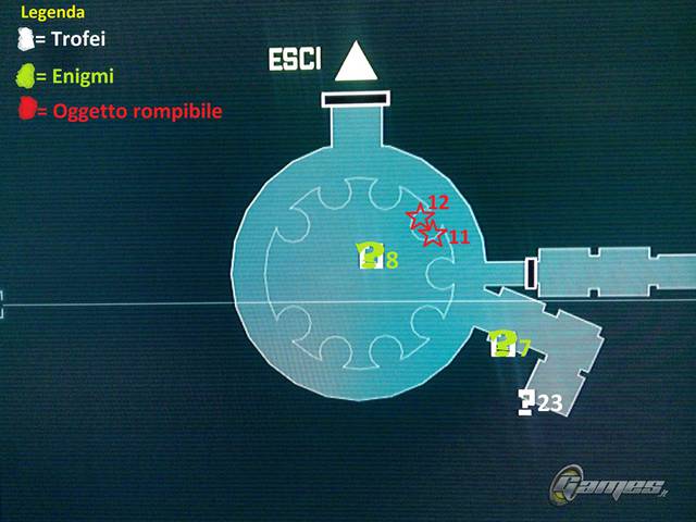 Trofeo Enigmista 9: Appena entrati nell’area di questa mappa usate il rampino per raggiungere la stanza superiore e di nuovo il rampino per prendere il trofeo sul soffitto.