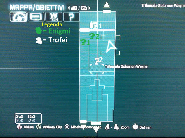 Trofeo enigmista 2: Nel sotterraneo del tribunale, nella cella accanto all’Uomo Calendario, per aprire la cella usate la modalità Detective per individuare la scatola di fusibili da mandare in corto. Una volta individuata tornate al piano superiore e guardate poco sopra la porta di uscita, noterete dei cavi scoperti che mandano elettricità, usate il Batarang telecomandato, elettrificatelo facendolo passare in mezzo alla corrente e guidatelo sui fusibili per aprire la cella.