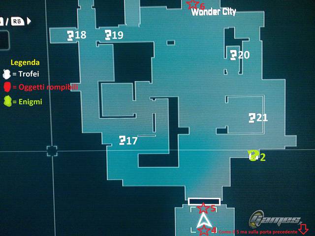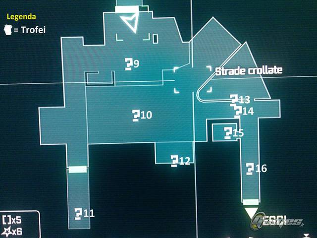 Trofeo enigmista 14: Questo trofeo è nascosto da un pannello fragile che potrete rompere SOLO con il potenziamento rampino ( sbloccabile dopo aver completato 4 missioni Realtà Aumentata ). Posizionatevi sul fronte opposto della mappa e planando verso il trofeo, usate il rampino premendo 2 volte A/X in modo tale da attivare il potenziamento rampino e sfondare il muro fragile.