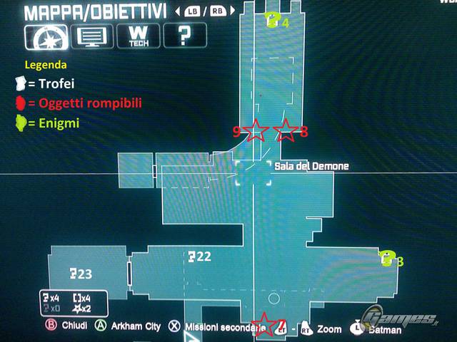 -Marchi del Demone 12 ( Per i marchi non ci sono foto visto che sono facili da individuare, sono comunque segnati sulla mappa e di solito posizionati sopra archi o porte come simbolo di ornamento, per distruggerli dovrete usare il Bat-artiglio! )![]()