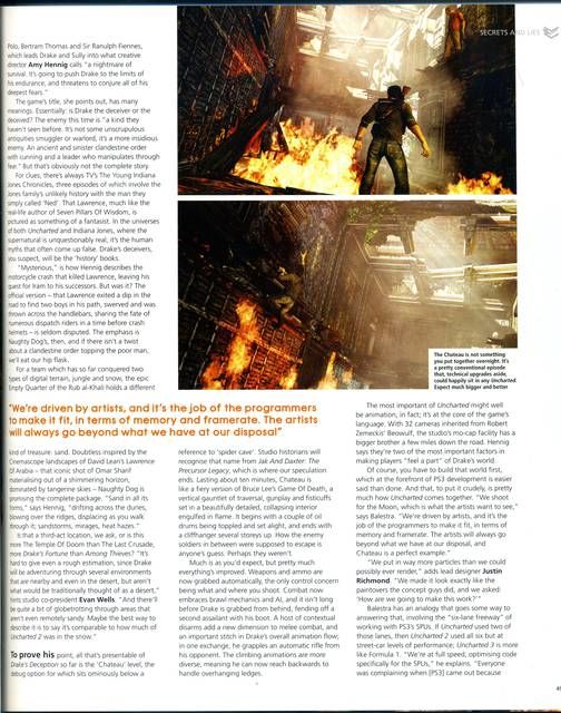 Justin Richmond: Più che di Motion Capture direi che è meglio parlare di Performance Capture, tecnica che “cattura” gli attori VERI che recitano le scene VERE, vale a dire quelle che i giocatori vedono e rivivono su schermo. Ha differenza del Motion Capture che invece “cattura” attori qualsiasi. In sostanza quello che i giocatori vedono su schermo è stato realmente girato, ripreso e riproposto nel gioco. Ovviamente questo discorso cade sulle scene più estreme per le quali abbiamo giocoforza dovuto ricorrere a qualche trucco scenografico, come appendere gli attori a delle imbragature per le riprese dove Nathan viene risucchiato dall’aria mentre è su un aereo.