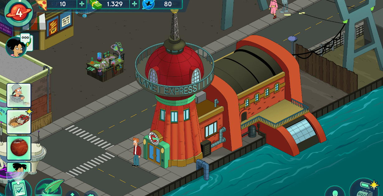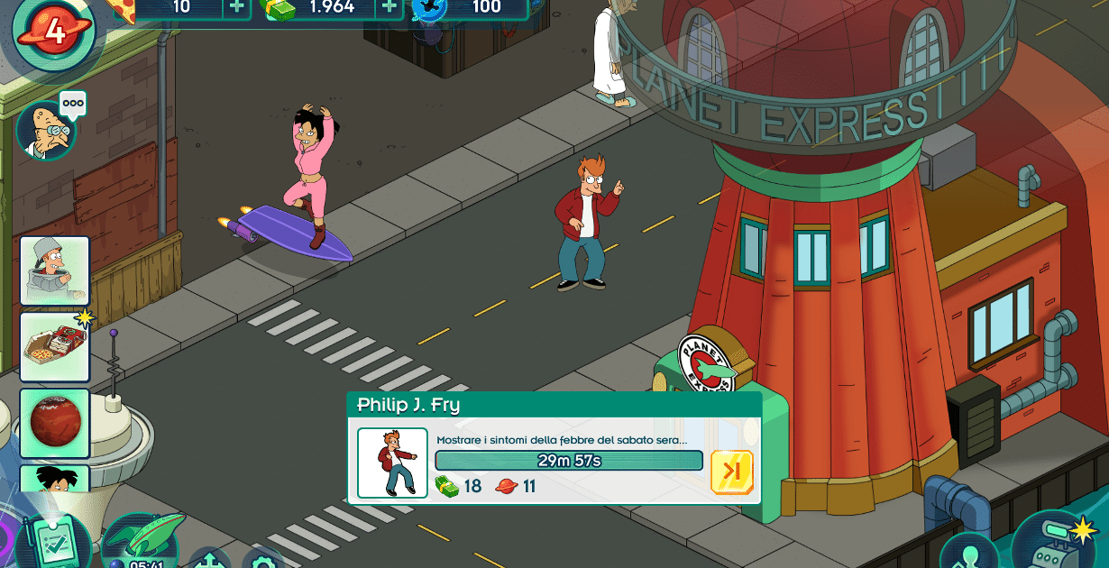 Sulla falsariga dei già citati titoli dello sviluppatore statunitense, le meccaniche di gioco principali ci permettono di posizionare il gioco nel genere dei gestionali. Nel tentativo di ripristinare l’ordine all’interno della metropoli e salvare i colleghi della Planet Express dovremmo investire tempo, Nixon-dollari e Pizza per sbloccare le aree della città oscurate dalle crepe spaziali. Ogni compito assegnato ai personaggi, che può durare da un minimo di un minuto fino a decine di ore, ci ricompenserà con una quantità variabile di materiali che ci torneranno utili nel corso dell’avventura. Alcuni dei distretti della città, e relativi personaggi bloccati, saranno ottenibili soltanto se saremo in possesso di determinati reperti sparsi in giro per la galassia.