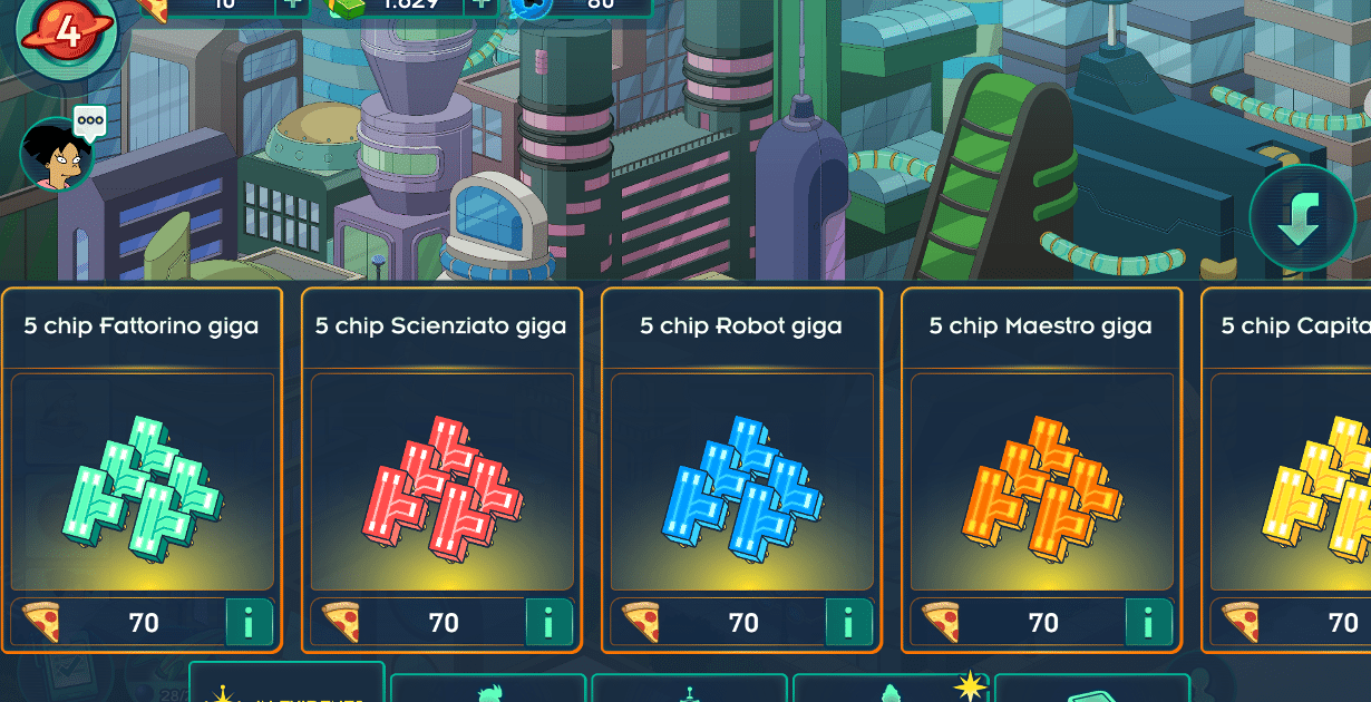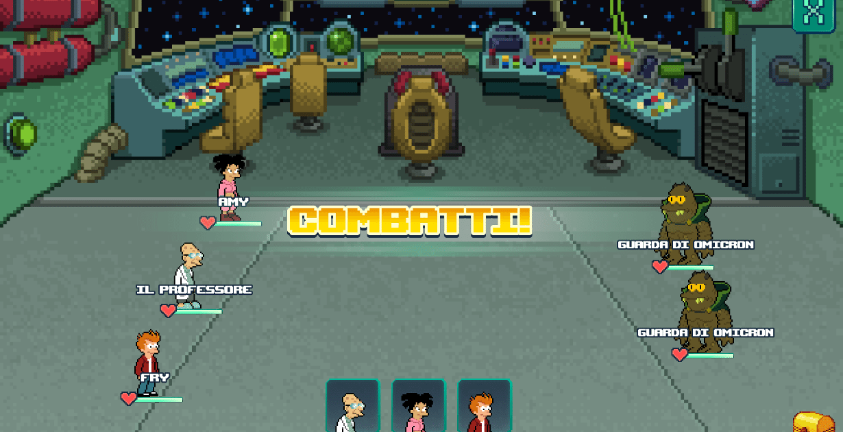 Ed è qui che il gioco si fa interessante: andando in missione sui vari pianeti incontreremo i relativi nemici, anch’essi tratti dalla serie, che dovremo combattere in una sorta di minigioco in stile RPG: ci troveremo a batterci contro Omicroniani e Scaramucche in scontri a turni nei quali però l’unica nostra interazione sarà tappare lo schermo a tempo: sul nostro personaggio al fine di aumentarne la difesa, o su un avversario per potenziare i danni inflitti dal nostro attacco. Anche in questo caso, al termine dell’incontro riceveremo una ricompensa, e avremo la possibilità, ma non la certezza assoluta, di droppare materiali rari o i reperti di cui parlavamo prima. Questo, unito al fatto che i personaggi impegnati in qualche azione sul suolo terrestre non possono essere mandati in missione nello spazio, rende l’avventura tremendamente lenta e frustrante. Potremo velocizzare le cose acquistando con valuta reale le fette di Pizza, ed investendole per terminare azioni istantaneamente, liberando i personaggi per le missioni spaziali. Trascuriamo la possibilità di poter ottenere una fetta di Pizza in maniera gratuita ogni volta che si accetta di guardare un video sponsorizzato, considerando che sbloccare determinati personaggi o reperti può richiederne centinaia.