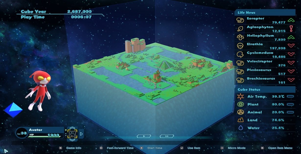 Vediamo il cubo dalla distanza. In questa fase possiamo far scorrere il tempo molto velocemente (perdendo punti vita), oppure a velocità sostenuta (recuperando punti vita), per far nascere nuove creature e piante.