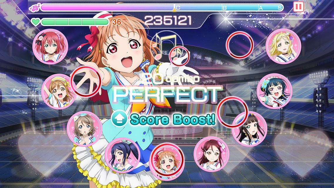 In Love Live! School Idol Festival è possibile giocare in due diverse modalità “Story” e “Live” con una squadre formata da 9 idol a nostra scelta. Originariamente nel gioco erano disponibili soltanto le idol della prima serie (le μ’s), successiamente nel 2016 sono state aggiunte le idol della nuova serie animata chiamate Aqours. Ogni giocatore può scegliere liberamente tra i diversi personaggi per creare il proprio team. Nella modalità “Live” il giocatore dovrà, come nella maggior parte di giochi ritmici, cliccare al momento opportuno dei “cerchi” al ritmo di musica. Le idols e le canzoni sono divise in tre diversi attributi: smile, pure e cool. I giocatori dovranno necessariamente creare dei team che rispettino gli attributi per poter ottenere un punteggio più alto durante l’esibizione.