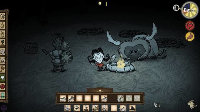 Tutto semplice, apparentemente, se non fosse che l’ambiente nel quale Wilson deve muoversi si dimostra incredibilmente inospitale, e perlopiù abitato da creature ostili che fanno di tutto per danneggiare il protagonista. Gli sviluppatori hanno avuto infatti la riuscitissima idea di creare un ciclo giorno/notte in tempo reale estremamente veloce. Le 24 ore di una giornata in Don’t Starve equivalgono a circa 10 minuti reali, e l’avanzare dei giorni porta al cambio delle stagioni. Il giocatore si trova quindi ad affrontare un costante cambiamento di scenario, anche climatico. Durante la notte, peraltro, alcune creature dell’oscurità attaccano Wilson senza remore, obbligandolo a restare sempre e comunque illuminato, che si tratti del sole naturale, del bagliore di un fuoco o di luce artificiale. Restare al buio solo pochi secondi equivale a morte certa, e poco importa siate resistiti cinque, dieci o cento giorni sino a quel momento: l’auto salvataggio sovrascrive i progressi della partita, e si riparte da capo.