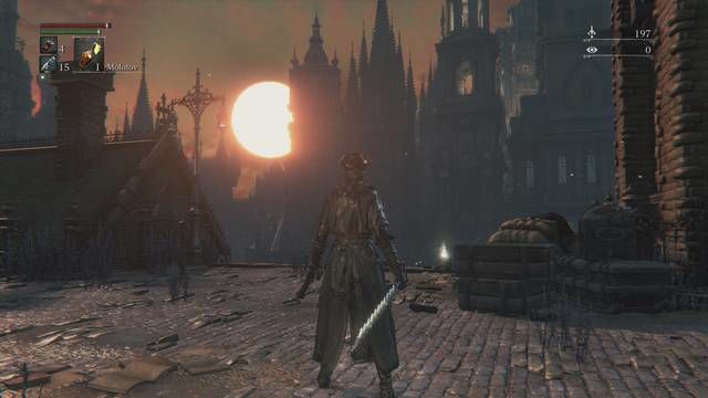 Lo “starter pack” è formato dalla Sega, un ottima arma di base, equilibrata e capace di trasformarsi in un lungo bastone dentato, l’Ascia, arma pesante e lenta ma dall’attacco devastante e il Bastone, un bastone d’acciaio capace di trasformarsi in un agile frusta. E qui che le caratteristiche RPG del titolo entrano in gioco, le armi infatti hanno dei parametri iniziali che stabiliscono le classi/passati che possono impugnarle: il Bastone ad esempio richiede 15 punti di Abilità, caratteristica che favorisce l’uso di armi meccaniche e che possiede solo il passato da Professionista. Scelte le armi bianche è possibile passare a quelle da fuoco che si distinguono tra Pistola e Fucile e si basano sempre sui parametri iniziali del passato scelto. Le armi da fuoco funzionano tramite proiettili di Mercurio che potranno essere trovati o comprati in gioco. I proiettili vanno imbevuti del sangue di un cacciatore e consumano Punti Vita quando vengono utilizzati. L’ultimo dono dei messaggeri sarà un Emblema del Cacciatore che permette al giocatore di azzerare i parametri del suo eroe sacrificando tutti gli Echi di Sangue utilizzati. Gli Echi sono la moneta del gioco con cui potremo potenziare l’eroe ed acquistare nuovi oggetti dalla Vasca dei Messaggeri nel Sogno del Cacciatore. Grazie alle Lapidi presenti potremo tornare a Yharnam raggiungendo le Lanterne che saranno delle vere e proprie ancora di salvezza, un po’ quello che erano i Falò in Dark Souls 2. Tornati alla Lanterna della clinica dovremo riaffrontare il lupo ma questa volta avremo dalla nostra l’arsenale appena scelto e con cui sbarazzarci della creatura in poco tempo. Ora saremo finalmente pronti a raggiungere la città dove il giocatore verrà messo al corrente di pochissime ma sostanziali informazioni: È la notte della caccia a Yharnam, labirintica città in cui si sta diffondendo una strana malattia che trasforma gli abitanti in mostruose e folli bestie. I pochi sopravvissuti sono barricati in casa e sono molto ostili con i forestieri.