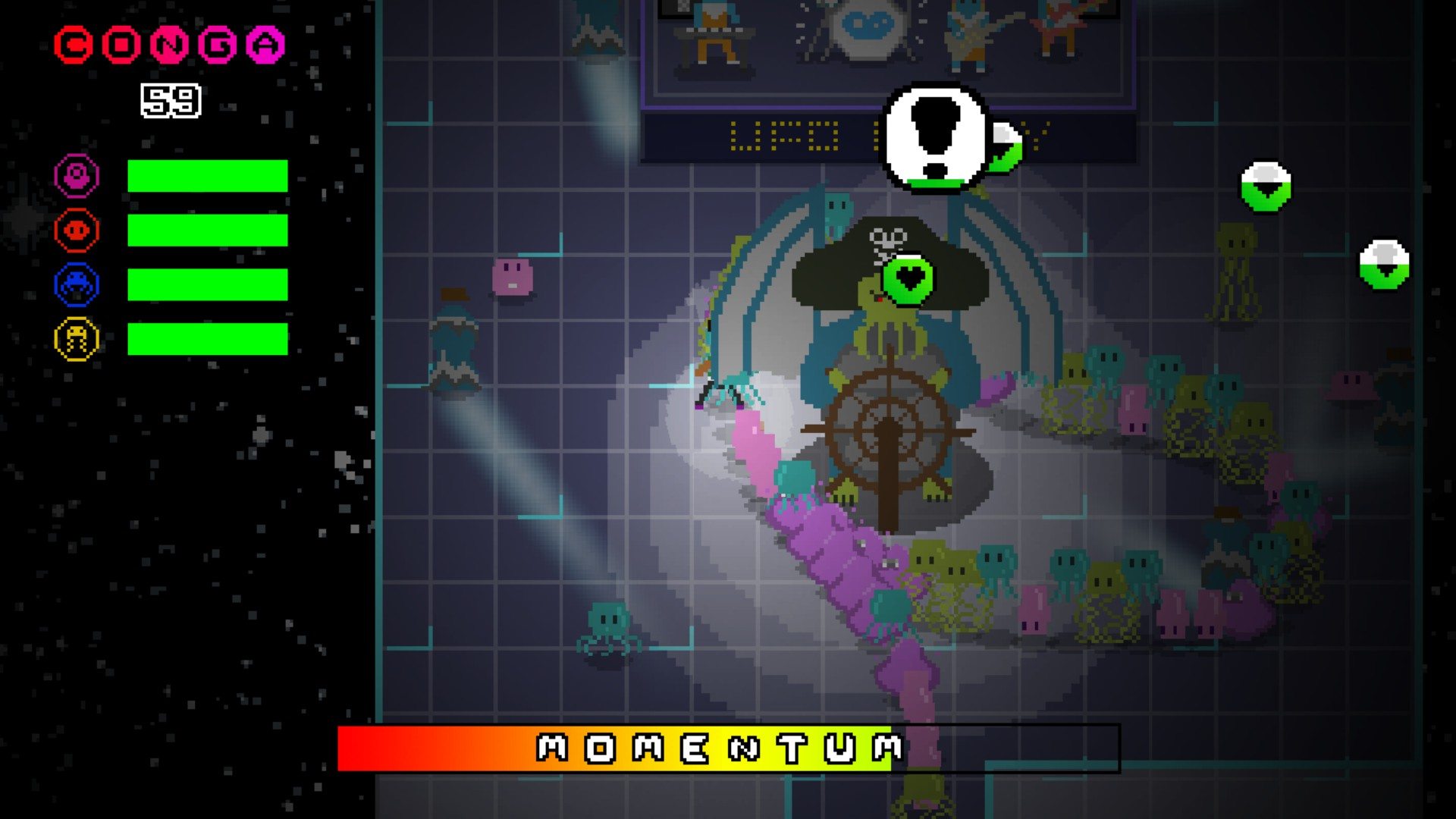 Sarà così, invadendo lo spazio personale di questi personaggi isolati, che potrete attirarli nella vostra danza , aumentando, in questo modo, la lunghezza della vostra linea e ricaricando il “Momentum”. Così, mentre il tuo conga cresce, crescerà anche la tua capacità di far cadere nel tranello altre reclute. Tutto ciò, ovviamente, ritarda la fine della tua danza e, di conseguenza, fa aumentare il tuo punteggio.