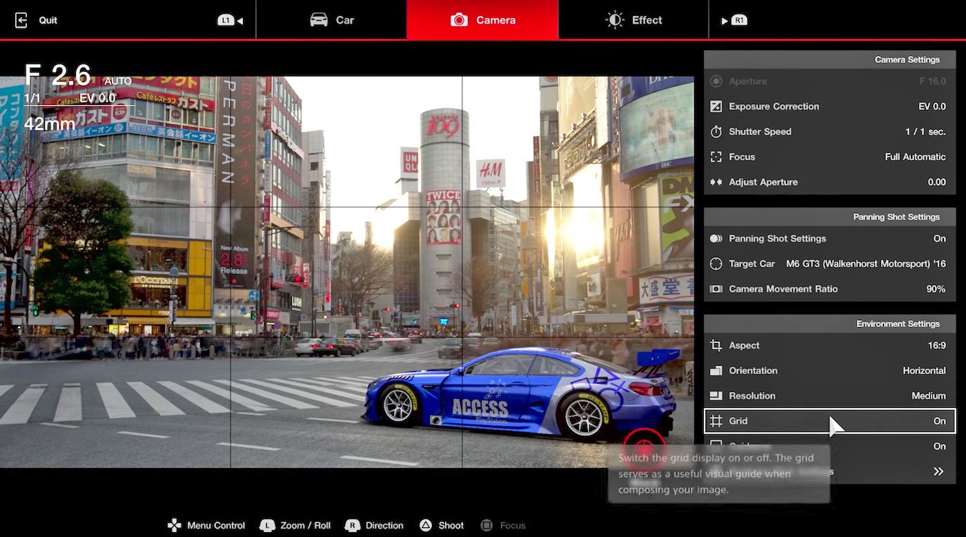 Lo scroll orizzontale invece contiene i menù di gioco. La modalità arcade, dove cimentarsi in gare singole, prove a tempo, gare di derapata, sfide in locale e tour con il VR. Venendo invece alla parte centrale del gioco abbiamo la classica campagna, fatta di accademia, ovvero lezioni da dover superare per prendere confidenza con il gioco e con le sue meccaniche (leggasi “patenti” da sempre un must di Gran Turismo) che ci regaleranno dei bonus e delle ricompense. Passando per le sfide, prove di un livello decisamente più impegnativo e arrivando fino all’esperienza circuito, ovvero dei tutorial dove studiare le varie piste settore per settore. A questo si associa la modalità online, la mappa con i vari costruttori e le relative auto che potremo comprare e infine un creatore di location per immortalare i nostri bolidi in vere e proprie sessioni di shooting fotografico.