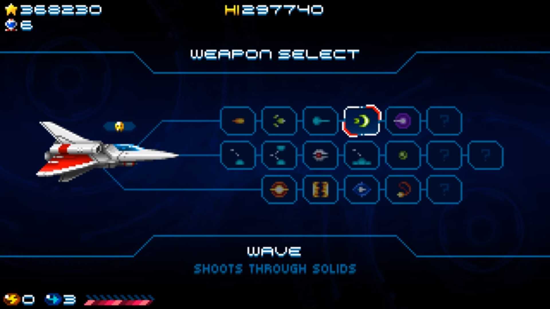 La nostra bellissima navicella è dotata di tre tipologie diverse d’equipaggiamento: arma primaria e secondaria e un ulteriore accessorio in grado di fungere sia da supporto offensivo che difensivo. Tutte e tre le tipologie di equipaggiamento vanno decise ad inizio missione tramite una comoda schermata.