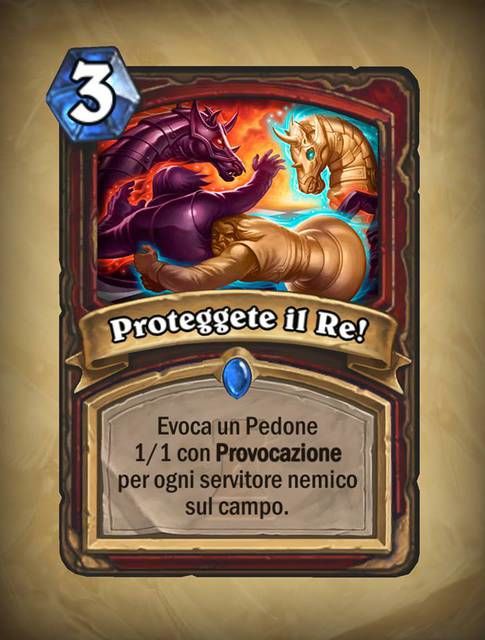 Le carte ottenibili con gli scacchi sono piuttosto interessanti: abbiamo il “Cavallo d’avorio” (costo 6, 4/4, grido di battaglia: rinvieni una magia, rigenera salute al tuo eroe pari al suo costo) e “Proteggete il re!” (costo 3, magia guerriero, evoca un pedone con provocazione 1/1 per ogni servitore nemico).