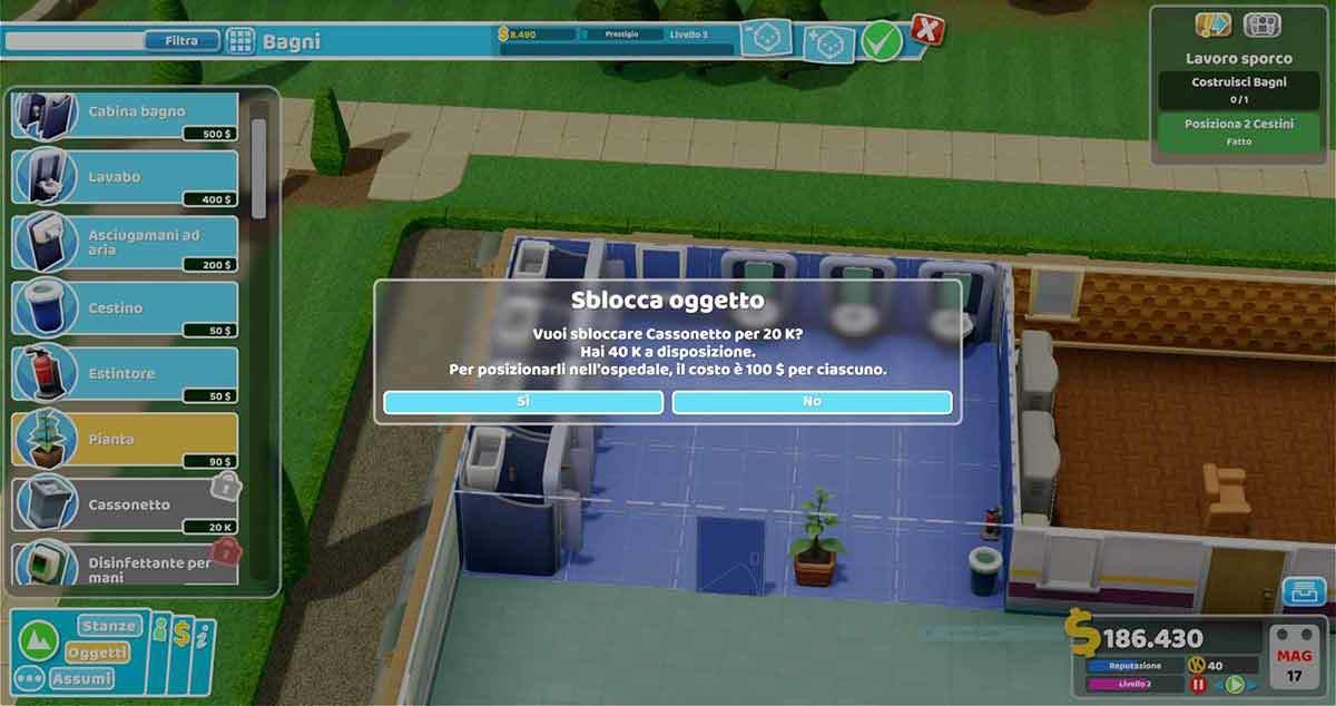 Analizziamo prima di tutto la costruzione delle stanze. All’inizio di ogni livello abbiamo già un edificio ospedaliero, però completamente vuoto, senza muri interni. Toccherà a noi collocare i vari ambulatori, sale operatorie, bagni e altri servizi e arredarli. La costruzione delle mura è identica a quella di Theme Hospital, dovremo trascinare un rettangolo e quando saremo soddisfatti collocheremo la stanza. All’interno, oltre alle apparecchiature mediche specifiche di quella sala, ad esempio una macchina per eseguire un operazione, possiamo aggiungere degli oggetti decorativi come piante, cestini, librerie che miglioreranno il suo livello di qualità. Se esauriamo lo spazio per le stanze, niente paura: sarà possibile acquistare dei lotti aggiuntivi per espandere il nostro ospedale.