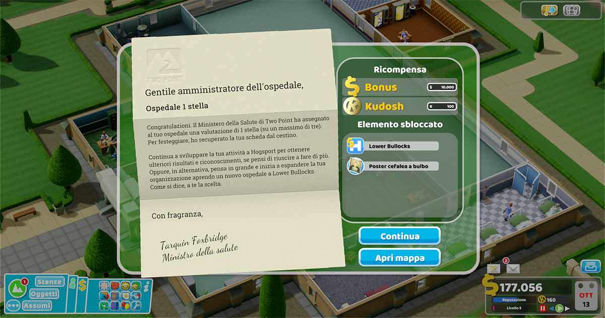 Ci sono poi gli obbiettivi di ogni singolo ospedale come ad esempio guadagnare una somma di denaro, curare un certo numero di malati di una malattia, aumentare il valore di una stanza, ecc… Questi obbiettivi sono racchiusi in step, ogni livello ha 3 step, rappresentati da stelline, ognuna di queste ci darà una stella e dei kudosh (ne abbiamo parlato prima, permettono di sbloccare nuovi oggetti). Per passare all’ospedale successivo sarà necessaria almeno una stella su tre.