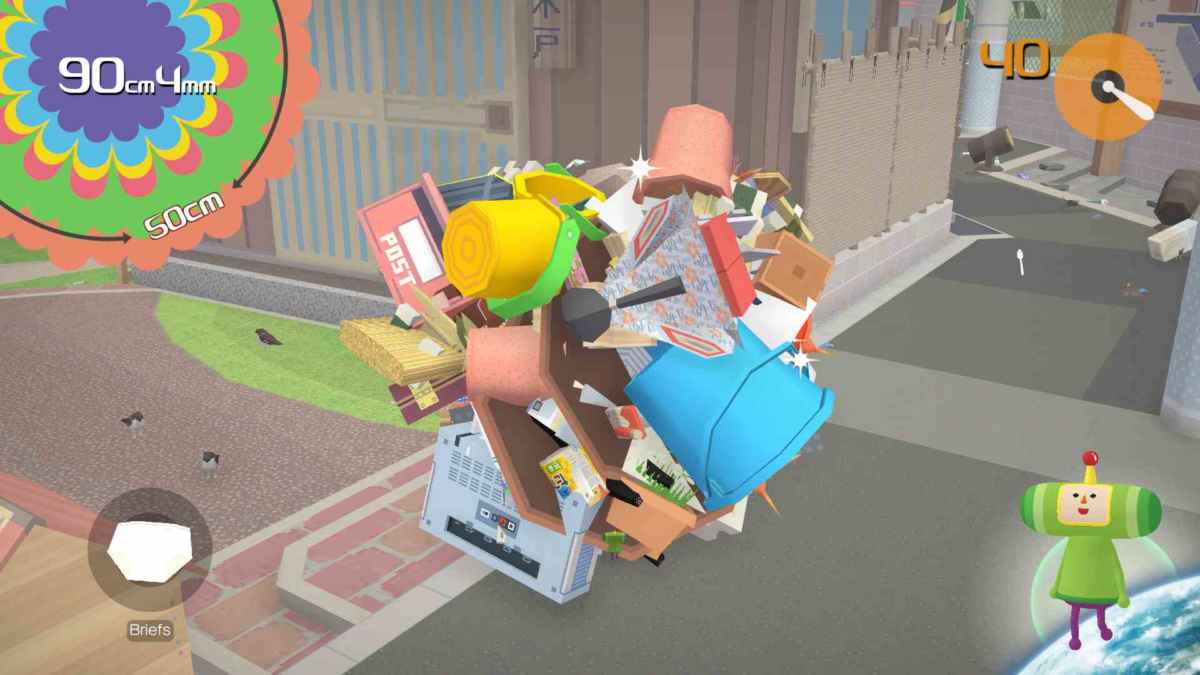 Questo meraviglioso gioco di prospettive permette di osservare da dentro i molteplici strati in cui i livelli di Katamari Damacy Reroll sono ambientati, ognuno dedicato formalmente ad un certo range di dimensioni. All’interno di città caotiche o case di gente che non butta via mai nulla ci ritroveremo a navigare per marciapiedi o mobiletti, accalappiando qualsiasi cosa; in tal senso, la grafica del gioco grazie ad una semplificazione di forme e colori risulta armonica e gradevole nonostante l’altissimo numero di oggetti a schermo.