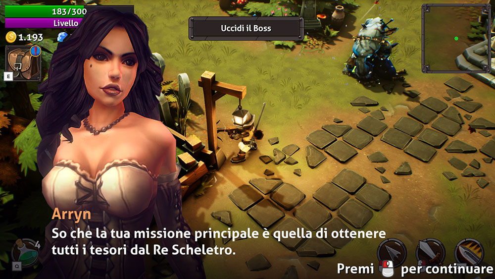 Dopo aver battuto un certo numero di Stage potremo tentare di nuovo di affrontare il Re Scheletro che ci ributterà di nuovo fuori a calci ma questa volta verremo premiati in base al grado di sfida che avremo selezionato per affrontarlo. Una volta rispediti da dove eravamo venuti ci vedremo azzerati tutti i loot trovati fino ad ora ma riceveremo delle pietre con cui potenziare le nostre abilità passive come i danni inflitti e l’armatura e ci verrà data l’opportunità di balzare direttamente allo stage 16.