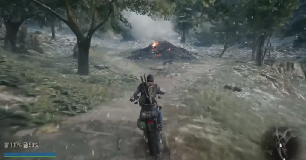 Se Aloy poteva cavalcare ogni sorta di belva techno-preistorica, passatemi il termine, Deacon avrà dalla sua una motocicletta che rappresenta il vero punto di forza della produzione. Viaggiare nell’Oregon di Days Gone a bordo della moto è davvero liberatorio e nonostante alcune incertezze nei comandi del mezzo, la guida scorre abbastanza fluida messa a repentaglio solo dalle trappole dei Ripugnanti, una sorta di setta di disadattati fuori di testa che sembrano essere usciti direttamente da Mad Max. Loro organizzeranno dei veri e propri agguati per mettere in difficoltà il giocatore, come corde tese o strade bloccate che porteranno Deacon a perdere la moto esponendolo allo scontro. A lungo andare però anche la moto diventa un peso perchè non si può cambiare e se per sbaglio ci si allontana per più di qualche passo poi bisogna tornare a prenderla e non basta fischiare per far si che ci corra incontro. Una gestione dei parcheggi interessante, che porta il giocatore a scegliere sempre accuratamente dove posizionarsi prima di ogni incursione in zone di combattimento, ma che col tempo rende il gameplay ancora più ripetitivo.
