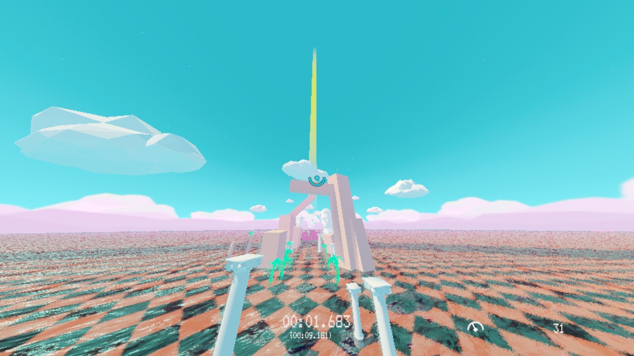 La prima cosa che salta all’occhio avviando una partita di Verlet Swing è infatti il setting decisamente atipico: teste di sculture romane, colori sul neon, delfini volanti e pavimentazione a quadrettoni che sembra uscita da una di quelle strane immagini che trovate sul vostro social network di fiducia. Chiunque abbia lavorato sul comparto artistico del titolo ha una certa dimestichezza con tale immaginario visto che è riuscito a reimmaginare in tale salsa una vasta gamma di non luoghi.