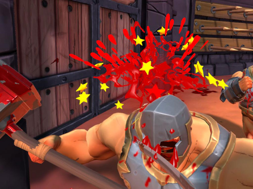 Per quel che concerne la grafica invece, GORN è un gran bel vedere, al netto degli omaccioni ben poco vestiti sempre davanti al nostro naso (che in VR non sono mai il massimo dello spettacolo). Le arene sono poche ma variano sostanzialmente l’una dall’altra per ampiezza e stile, dando una gradevole sensazione di progressione nel gioco. Lo stile fumettoso funziona molto bene nell’insieme, e gli effetti particellari di sangue, fumo e polvere sono tanto leggeri quanto coerenti con il resto dell’ambientazione. A lunghi tratti si ha l’impressione di essere stati catapultati in una remastered HD di “Tom e Jerry” per audio, video, e comicità.