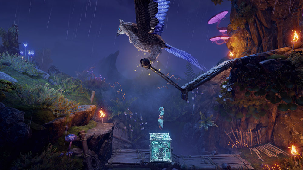 Trine 4 riprende il suo stile 2.5D dopo il 3D proposto dal terzo capitolo affinando ancora una volta il comparto sia artistico che tecnico presentando scenari fiabeschi dai colori tenui e musiche d’ambientazione pienamente calzanti. Anche questa volta dovremo alternare i tre eroi per progredire lungo il percorso alternando puzzle a sezioni di platform: Amadeus il mago grazie al potere della levitazione può spostare molti degli elementi sullo scenario come rocce o assi per creare ponti o aprire nuove vie, Zoya la ladra invece troverà approcci più diretti con il suo arco e il suo rampino che le permette di oscillare sui dirupi o collegare due elementi insieme, infine Pontius metterà non al nostro servizio la sua spada e il suo scudo per difenderci dai terribili incubi che infestano il mondo.