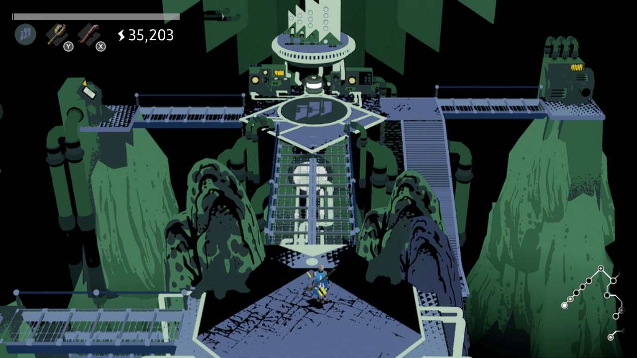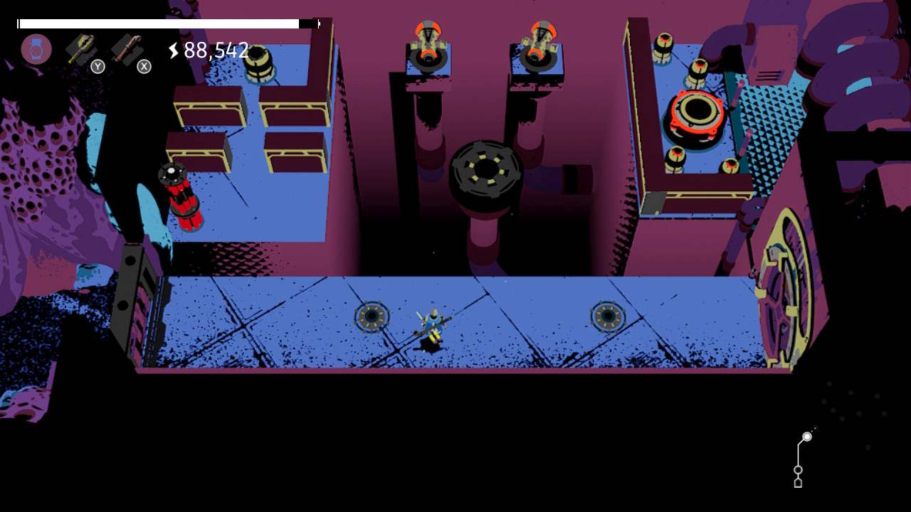 Questa scelta fatta da Flight School rende la difficoltà del titolo pressoché perfetta perché permette a qualsiasi tipologia di giocatore di trovare il percorso che preferisce e sfruttare le sue capacità per concludere il titolo, senza metterlo di fronte a picchi di difficoltà artificiale o chissà cosa; le uniche sfide obbligatorie che ci troveremo ad affrontare durante il corso del titolo saranno delle bossfight con la stessa creatura del pozzo. In tutto questo, tra un pericolo e l’altro, ci sarà per il giocatore il tempo per andare alla ricerca di passaggi e stanze segrete contenenti nuove armi o nuovi costumi per il nostro protagonista, tutti realizzati con una gradevolissima art direction che mostra un mondo sull’orlo del collasso in un futuro che raramente ci è capitato di poter assaggiare all’interno di un videogioco.