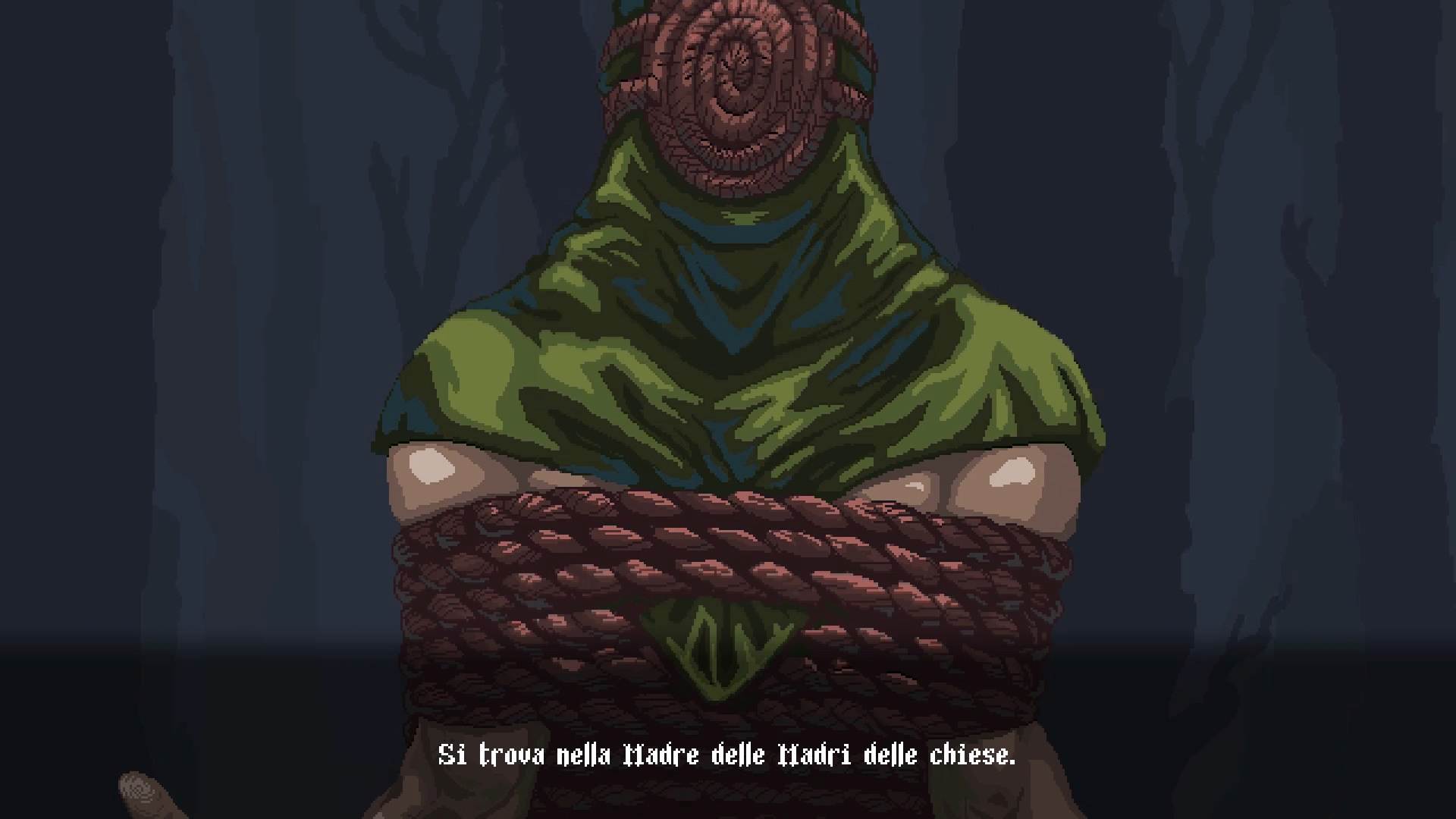 Per gli occhi e per le orecchie il titolo di The Game Kitchen è un capolavoro, con una delle migliori pixel art degli ultimi anni ed un artstyle che non ha davvero molti rivali nel mercato. Le ambientazioni trasudano sporcizia e dolore da ogni scorcio mentre le animazioni di personaggi e avversari lasciano spesso sorpresi per la quantità di dettagli presenti, con dei boss che visivamente finiranno per popolare le pagine tumblr o i profili twitter di molti appassionati. Il comparto sonoro è composto da tracce d’ambiente ed effetti sonori di grande qualità che riescono ad immedesimare perfettamente il giocatore nelle ambientazioni impazzite senza risultare iperrealistici; canti gregoriani atonali, archi e clavicembali rinascimentali, organi apocalittici e clangori infernali finiranno per sonorizzare i passi del penitente lungo l’infinito percorso che lo porterà verso quella che crede essere la redenzione definitiva.