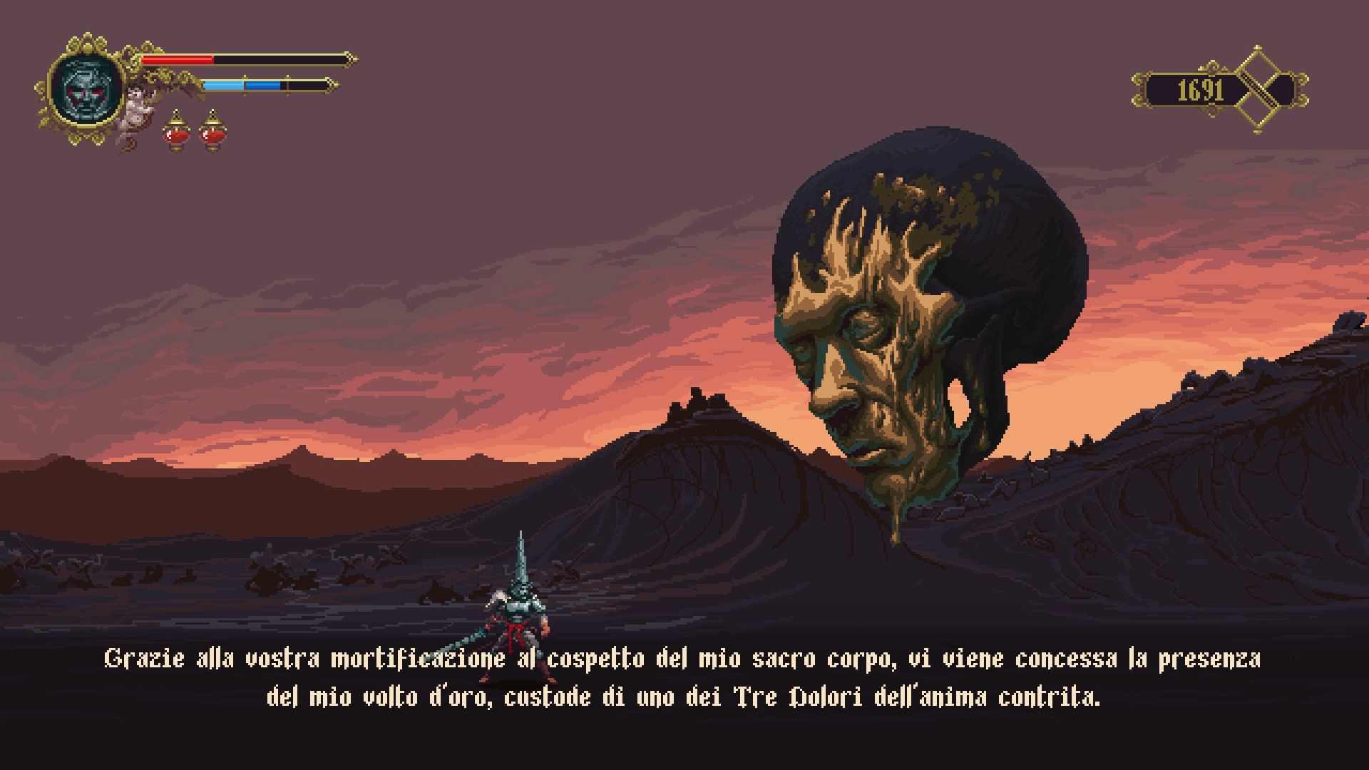 Il nostro caro penitente, privo di nome, come membro della confraternita dei penitenti silenziosi ha il compito di concludere il suo pellegrinaggio di redenzione superando una serie di prove e compiendo un sacrificio sulla vetta del mondo, al fine di redimersi da un peccato che è nascosto tra le righe della lore e che assume toni biblici. Armato della spada “mea culpa”, pur di raggiungere il suo scopo, il penitente (e noi con lui) dovrà attraversare una vasta gamma di ambientazioni estremamente ben caratterizzate e altrettanto ben realizzato a livello di design, con scorciatoie, arrampicate e porte da aprire in un secondo momento, sancendo ancora di più la sua anima metroidvaniosa.