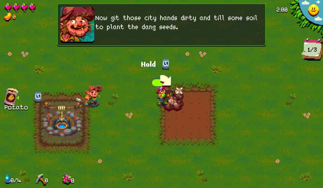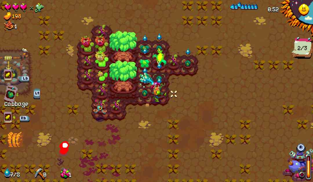 Le tempistiche del gioco, come già detto, non sono particolarmente generose: ogni giorno di gioco avremo circa cinque minuti di ore diurne per coltivare o esplorare le zone circostanti. Potremo piantare i nostri semi, allargare la zona coltivabile con l’utilizzo di appositi picconi droppabili dai nemici o acquistabili nella città, annacquare le nostre piante o concimarle. Le piante, molto varie tra loro e con rarità e bisogni diversi, hanno bisogno infatti di continue attenzioni per crescere abbastanza velocemente, ed è consigliato raccogliere ogni pianta prima del sorgere della Luna.