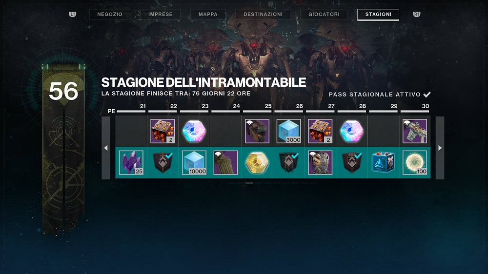 Infine, in questa sezione bisogna analizzare brevemente i Gradi Stagionali. Bungie ha deciso di abbandonare completamente i livelli dei personaggi e gli engrammi luminosi come unica ricompensa post-livello massimo. Entra quindi in gioco il sistema dei 100 Gradi Stagionali. Il nostro personaggio guadagna esperienza esattamente come prima, ma aumenta il proprio Grado Stagionale ottenendo ogni volta una ricompensa differente. I giocatori possessori del pass per la Stagione corrente ottengono immediatamente l’armatura stagionale per il proprio personaggio e il cannone portatile esotico Promessa di Eriana, poi si va avanti non ottenendo più un engramma luminoso, ma una volta una tonnellata di materiali, una volta un bonus all’esperienza permanente, un’altra una ricompensa un po’ più modesta e un’altra ancora persino un engramma esotico. Tutti i giocatori possono visualizzare cosa ottengono al raggiungimento di ciascun Grado Stagionale e abbiamo veramente di tutto, tant’è che gli ultimi livelli arrivano anche a dare un decoro esclusivo per la Promessa di Eriana, una nave esotica, un’emote esotica e un’intero set di decori universali per armature, andando immediatamente ad aggiungere carne fresca a questa nuova idea di trasformare tutte le passate armature stagionali in decori applicabili a tutte le armature leggendarie.